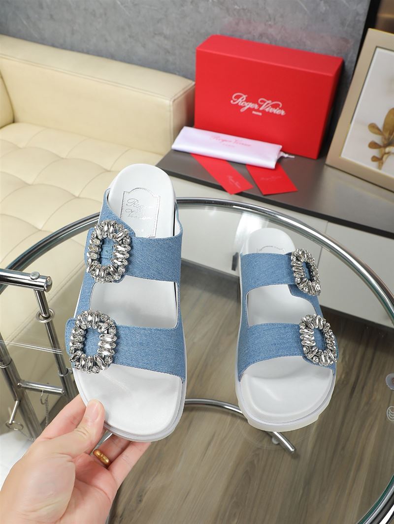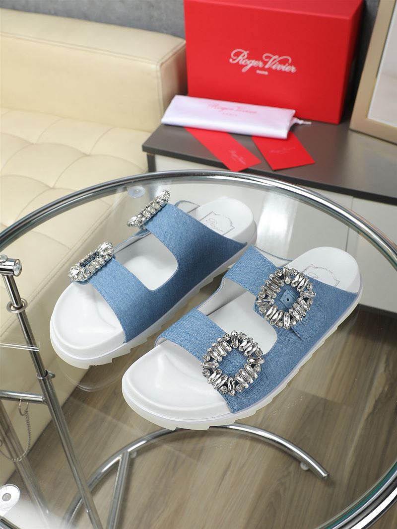 🏅🏅代购版本!2024新色【roge* vivie*】rv经典双扣原版1:1凉拖,颜色清新 准备穿上迎接夏日的沐浴吧☀️此款牛仔布面料毛须工艺,非常精细而难以操作。 🔸面料:牛仔布➕超柔羊皮内里➕奥钻钻扣(施华洛旗下) 🔸大底:原版定制橡胶大底 🔸码数:35-39(40可订制,不退换。)